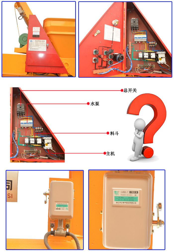 JS500攪拌機(jī)電控系統(tǒng)有空氣開關(guān)、熔斷器、熱繼電器,有短路保護(hù)、過載保護(hù)的功能。所有控制按鈕及空氣開關(guān)手柄和指示燈均在配電箱門上,并設(shè)有門鎖。按鈕上有防護(hù)罩。配電箱內(nèi)的電器元件裝在一塊緣板上,安全可靠,操作維修方便。